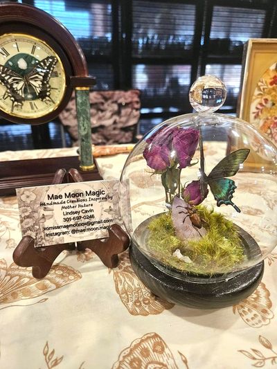 I dress as a fairy (Mae Moon) who uses materials from Mother Nature to create art that will last for generations! (Entomology Art & Pressed Flower Art) I also create magic wands, crowns and headpieces!